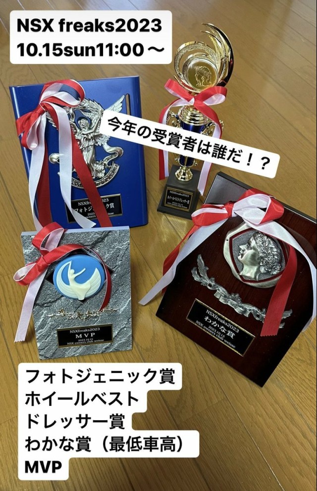 ホンダNSX 【ホンダNSXを100台以上展示します。】 NSX freaks2023 10/15sun 11:00〜 あいち健康の森公園にて開催 見学無料 参加者のみなさんから フォトジェニック賞 ホイールベストドレッサー賞 わかな賞(最低車高) MVP 上記4つの賞を選びます。 今年の受賞者は誰なのか 楽しみです。