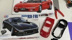 ホンダNSX 一連のクルマ模型製作の〝真打ち〟、タミヤ・1/24スポーツカーシリーズNo100ホンダ・NSX(初代NA1型)およびNo116マツダ・RX-7 R1(3代目FD3S型)の塗装に向けた準備工に入ります。 どちらもベースのプラスチックの色と大きく異なる色にするため、下地を塗ります。そのためにボディ部品を仮組みです。